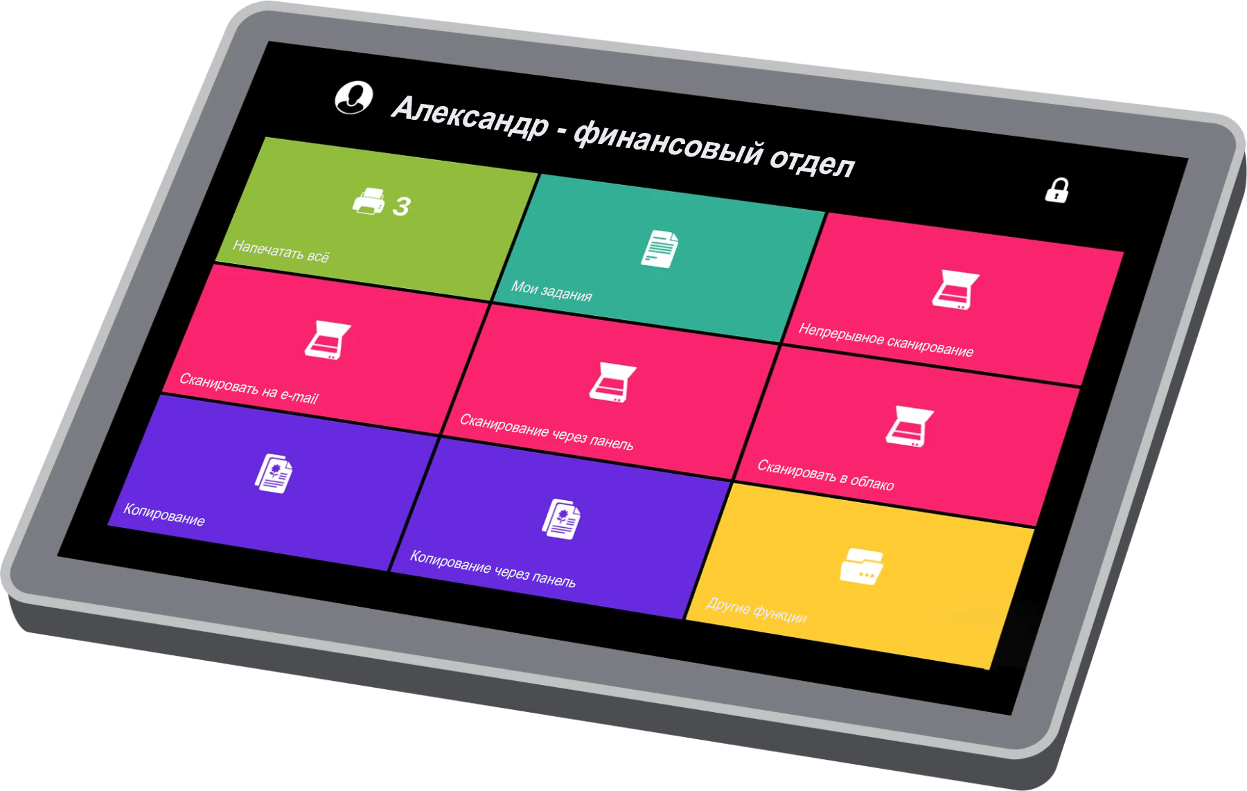 Благодаря хорошо структурированному, интуитивно понятному и персонализированному интерфейсу PRINT-X упрощает все операции с МФУ. Основываясь на предпочтениях пользователей/ групп, PRINT-X предложит вам ярлыки наиболее часто используемых настроек для сканирования, печати, копирования, а также кнопки быстрого доступа для других функций.
